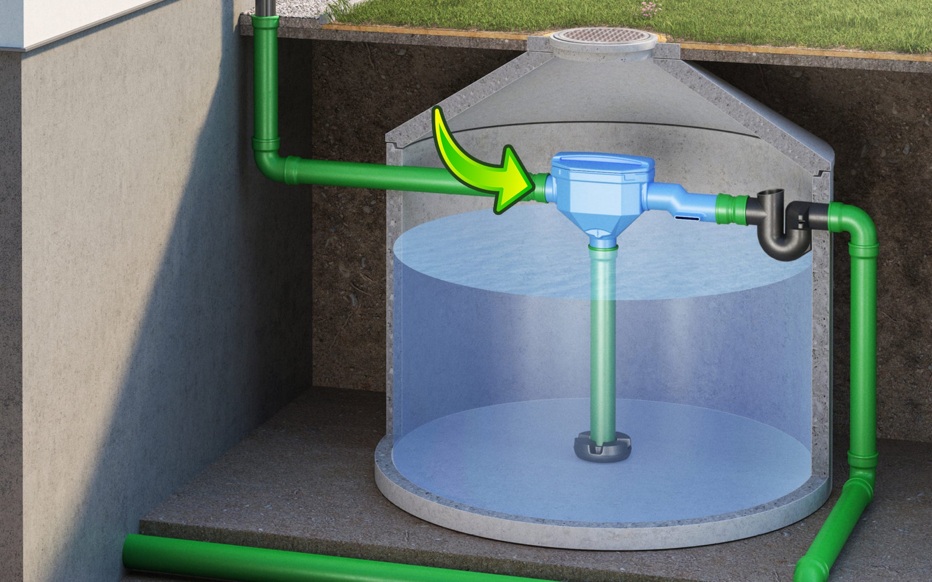 Rainwater filter for larger roof areas and rainwater tanks. The 3P Premium Skimmer Filter is installed in the rainwater tank and has a height offset of 7 cm. Due to its innovative design, this filter has a very large filter surface and a very high efficiency, independent of the volume flow, in order to channel as much rainwater as possible into the cistern. The dirt load is continuously flushed into the sewage system.