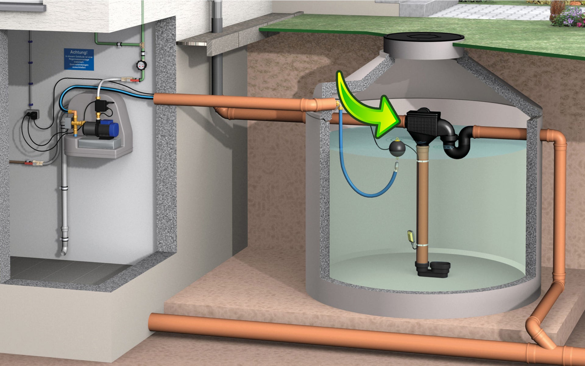 The internal screen surface is made of stainless steel (mesh size: 0.7 x 1.7 mm). The overflow siphon with odour trap and the suction of the surface water in DN 100 is already integrated in this filter (optionally also with backflow flap). The 3P siphon filter can be retrofitted with the 3P backwash set ZF. There is already an opening in the filter housing, which is closed with a cap. The cleaned water can be used for washing machine, toilet and garden irrigation.