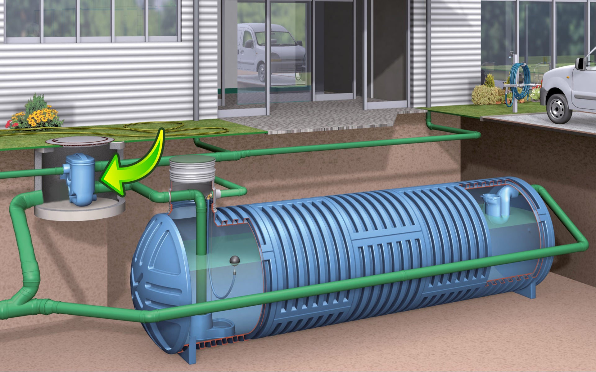 Due to its 2-stage cleaning principle, it has a high degree of efficiency independent of the volume flow. Due to the steep position of the filter inserts, the filtered- out dirt is continuously flushed towards the sewage system. The clean water is collected in a tank and fed into the storage tank.