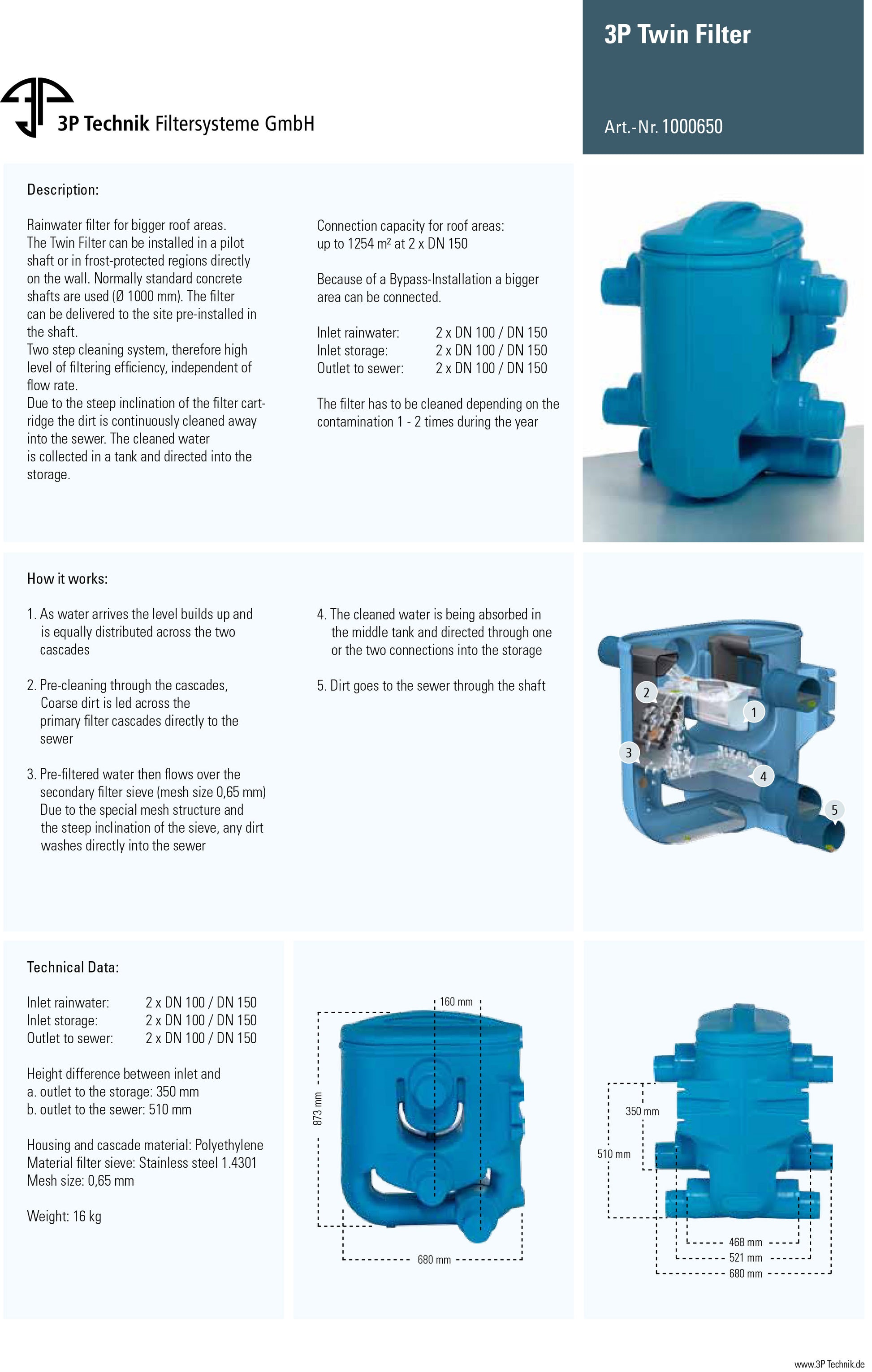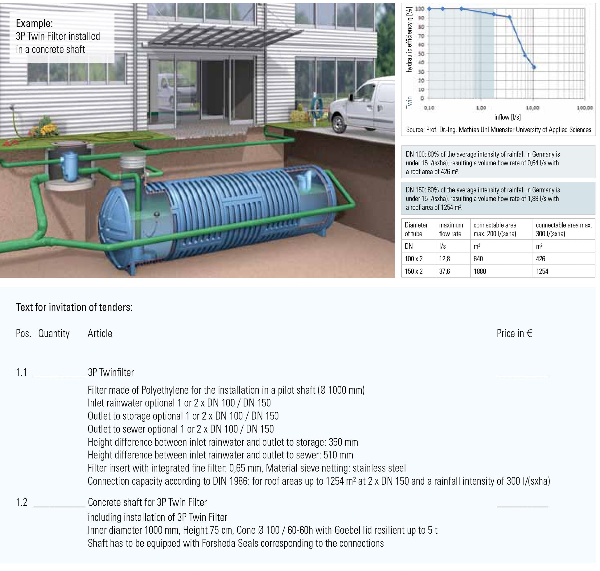 Rainwater filter for larger roof areas. The 3P Twin Filter can be installed in a pre- shaft or directly on the wall in frost-free regions. Standard concrete manholes (Ø 1000 mm) are usually used. The filter can be delivered to the construction site pre-assembled in the shaft.